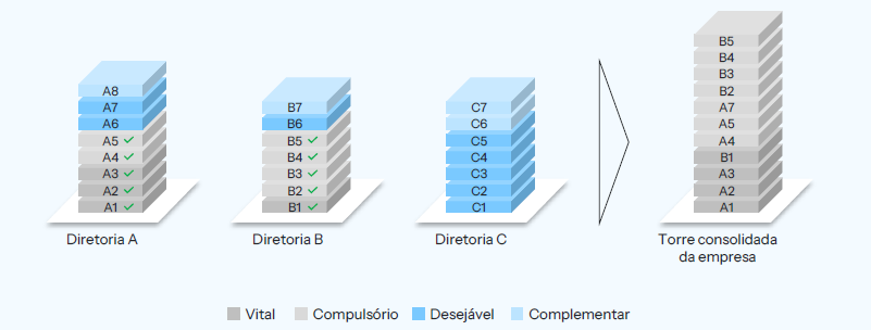 - Departamental: Cada diretoria constrói sua torre; depois, as torres são comparadas até formar a torre corporativa única.
